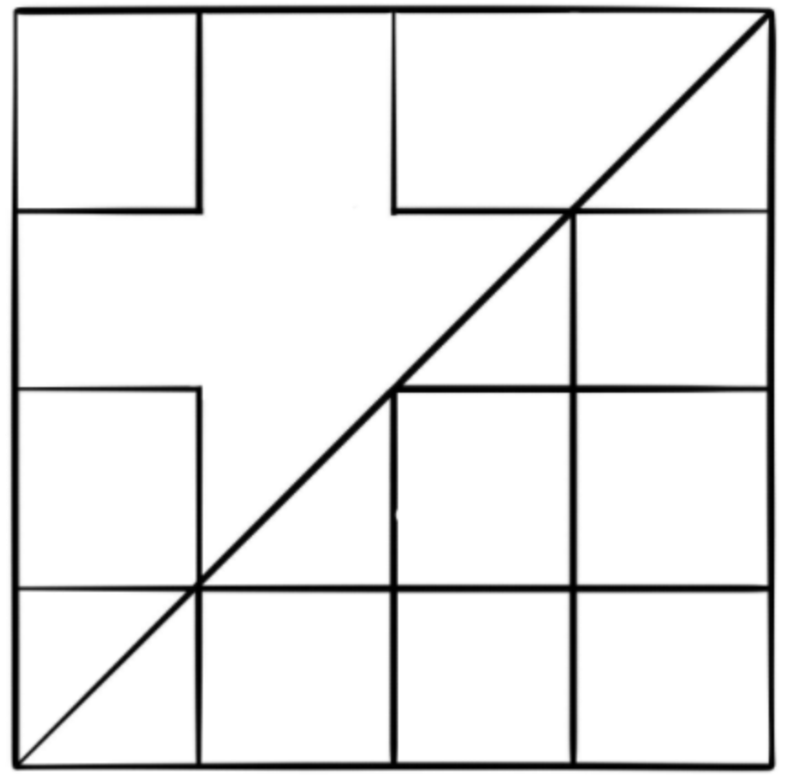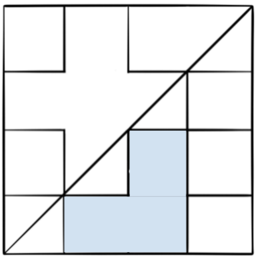 For example, the shading above is one way of setting up this problem. If you have some trouble with the prompt, think about it in terms of “parts of a whole.” In the top left, there is a small square. If you were to take that square and place it all around the larger shape, you would need 16 small squares. Therefore, each small square represents one of the larger 16. The blue shaded region is three of those squares, so we represent it as 3/16.